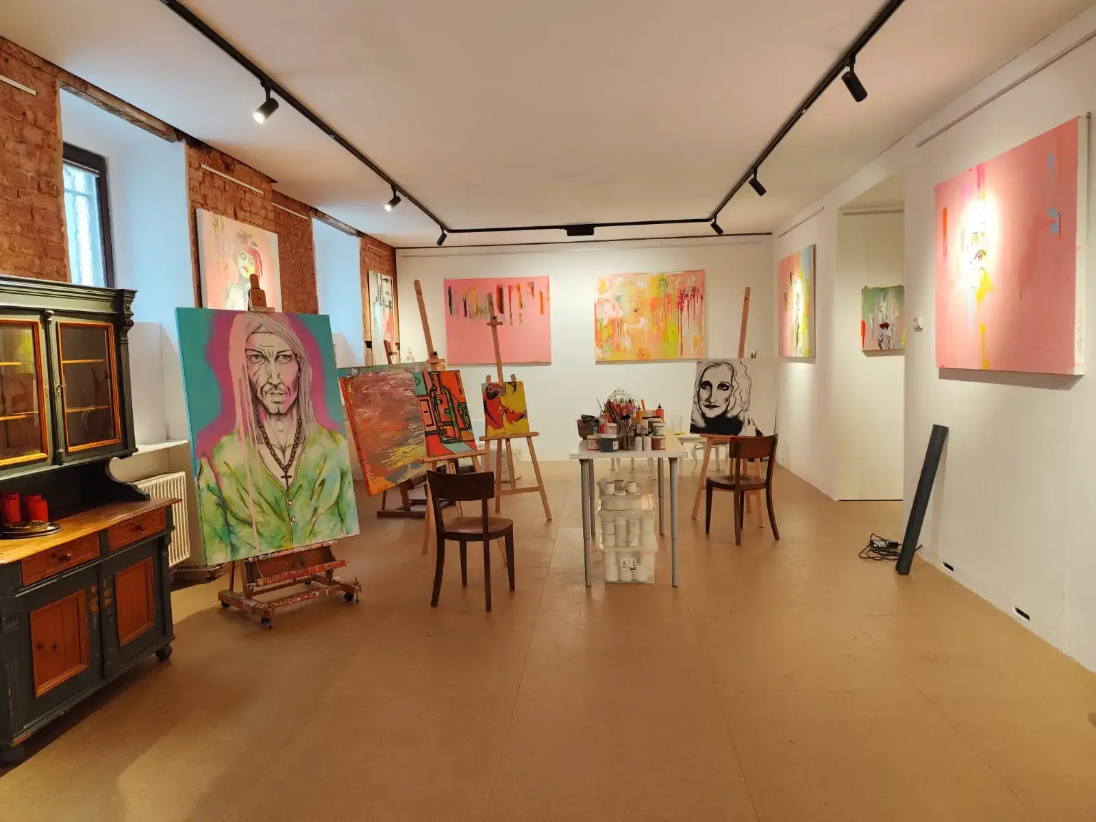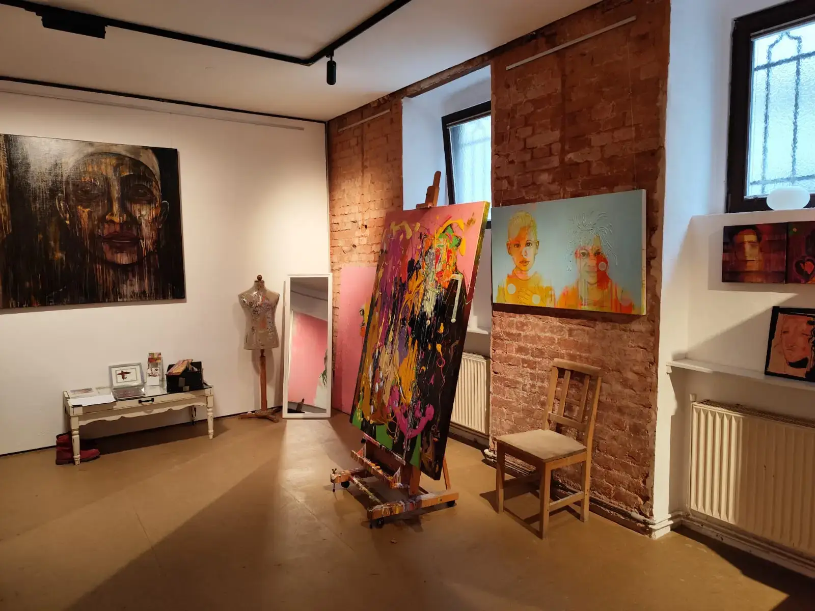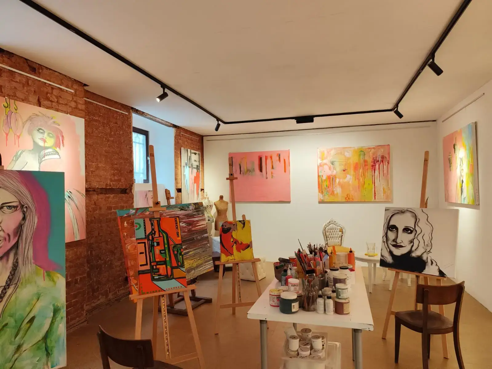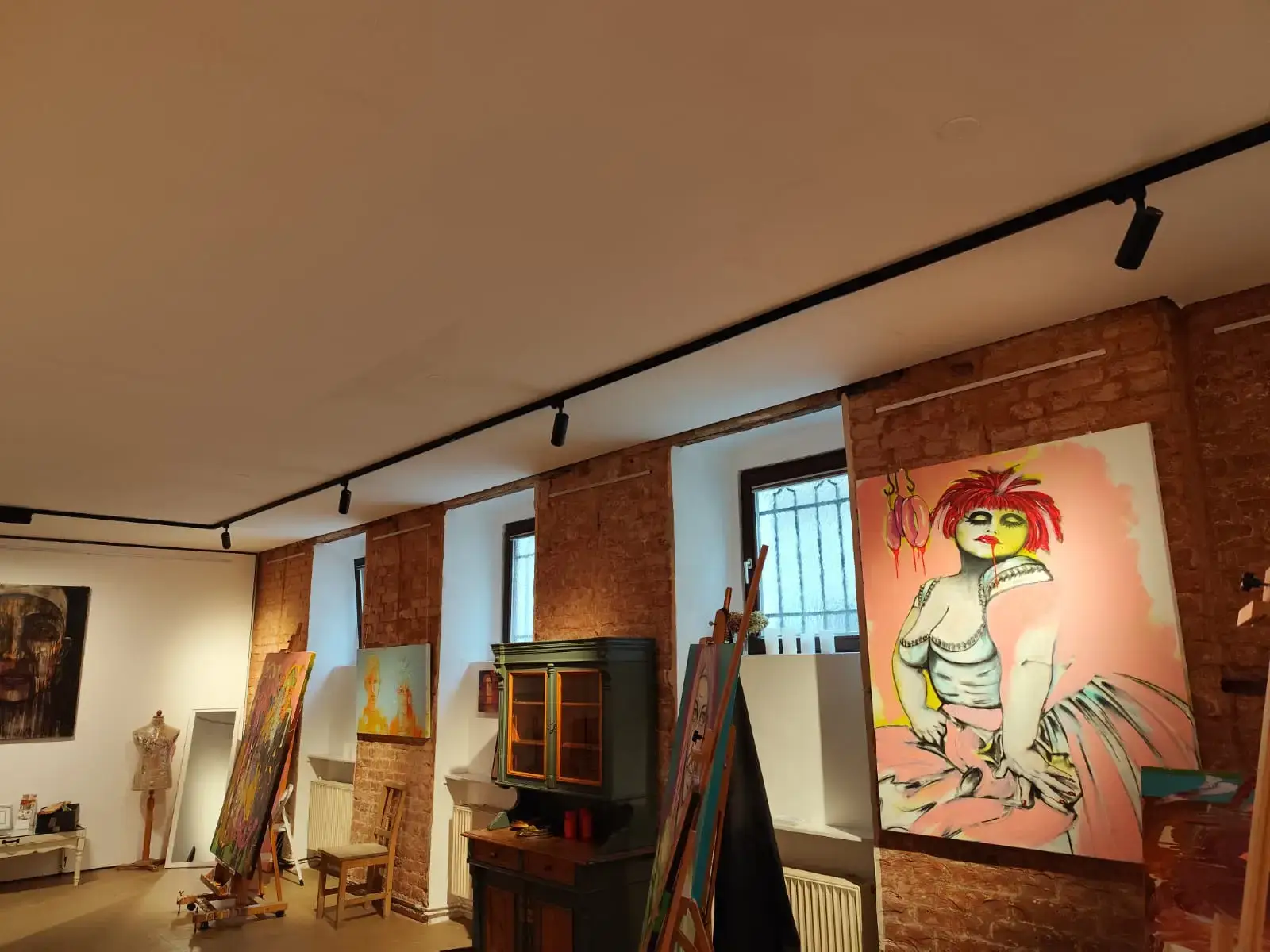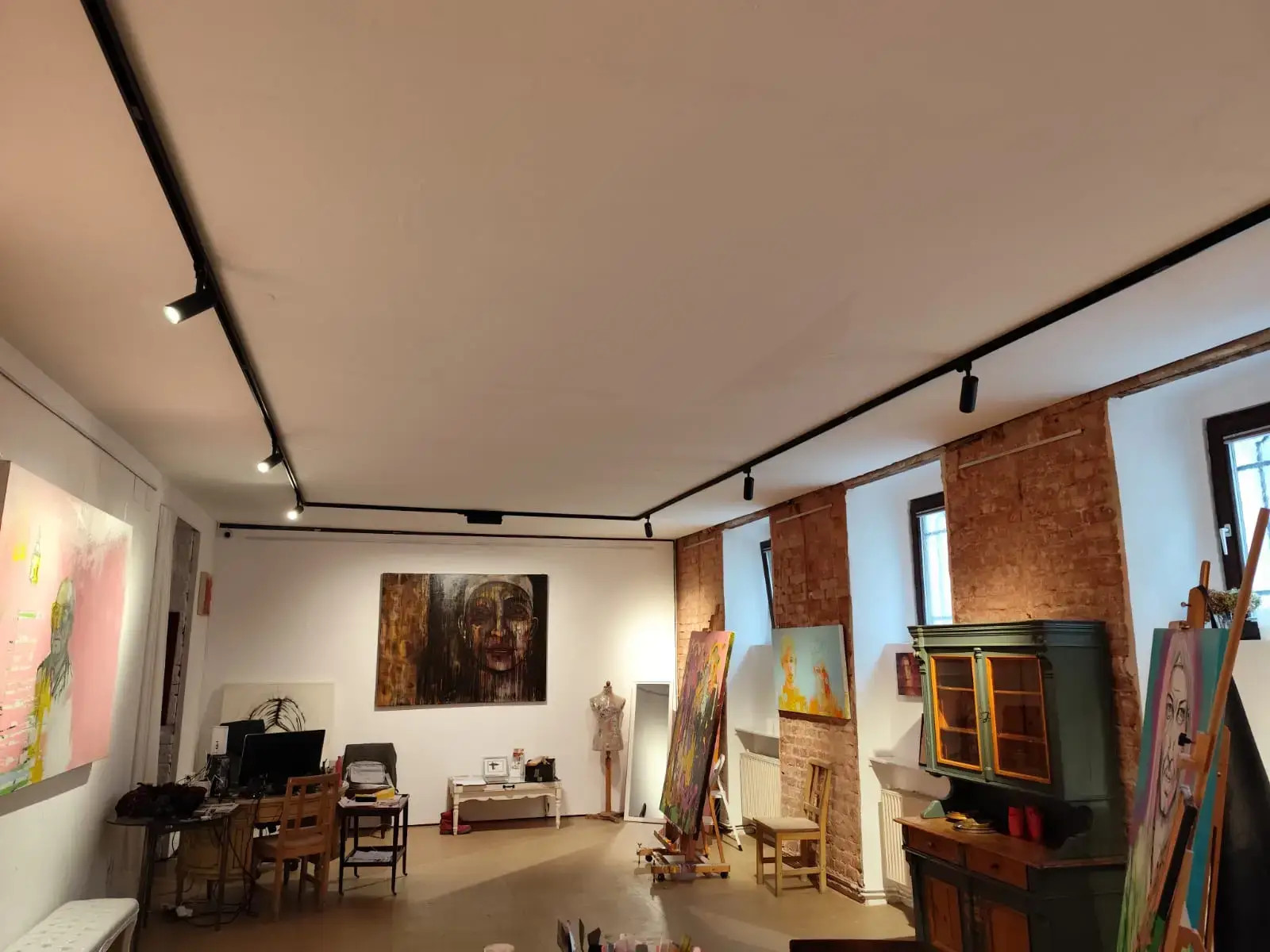 Eine kleine Küche samt Kühlschrank und Spüle, eine Toilette, Heizung, Möbel und eine Musikanlage sind ebenso vorhanden wie Galerieschienen, ein Beleuchtungssystem, Staffeleien und Basis-Malutensilien.