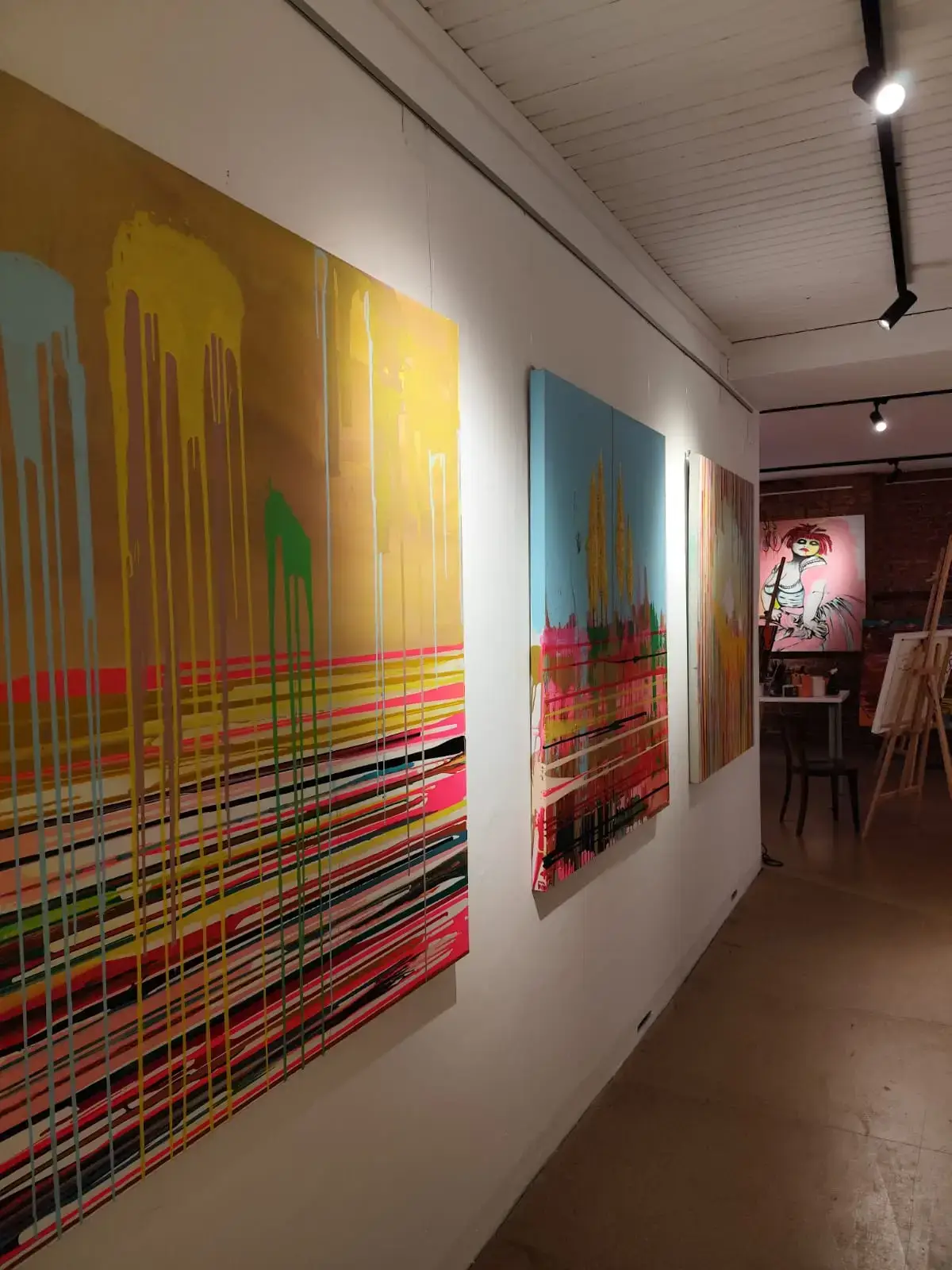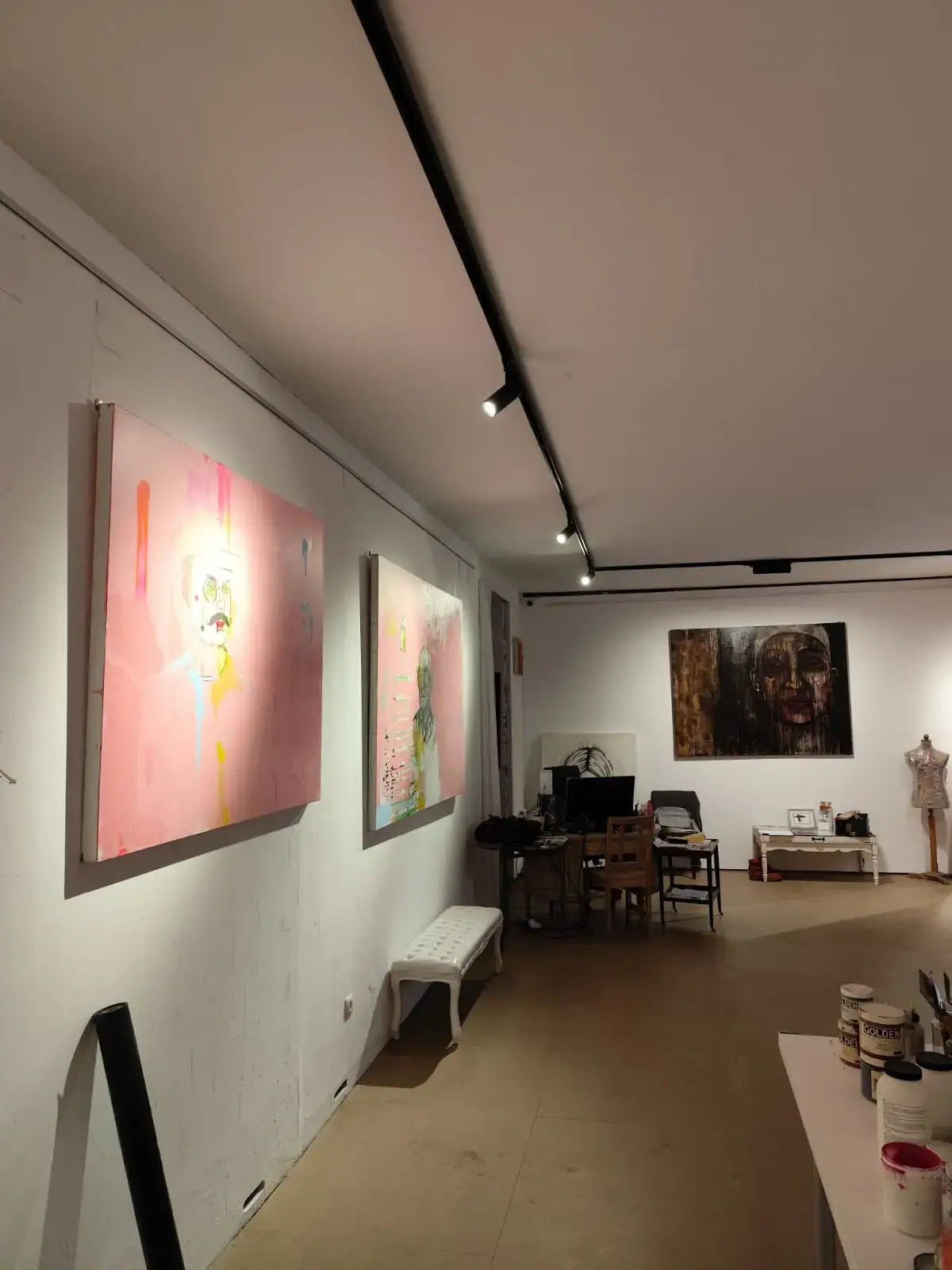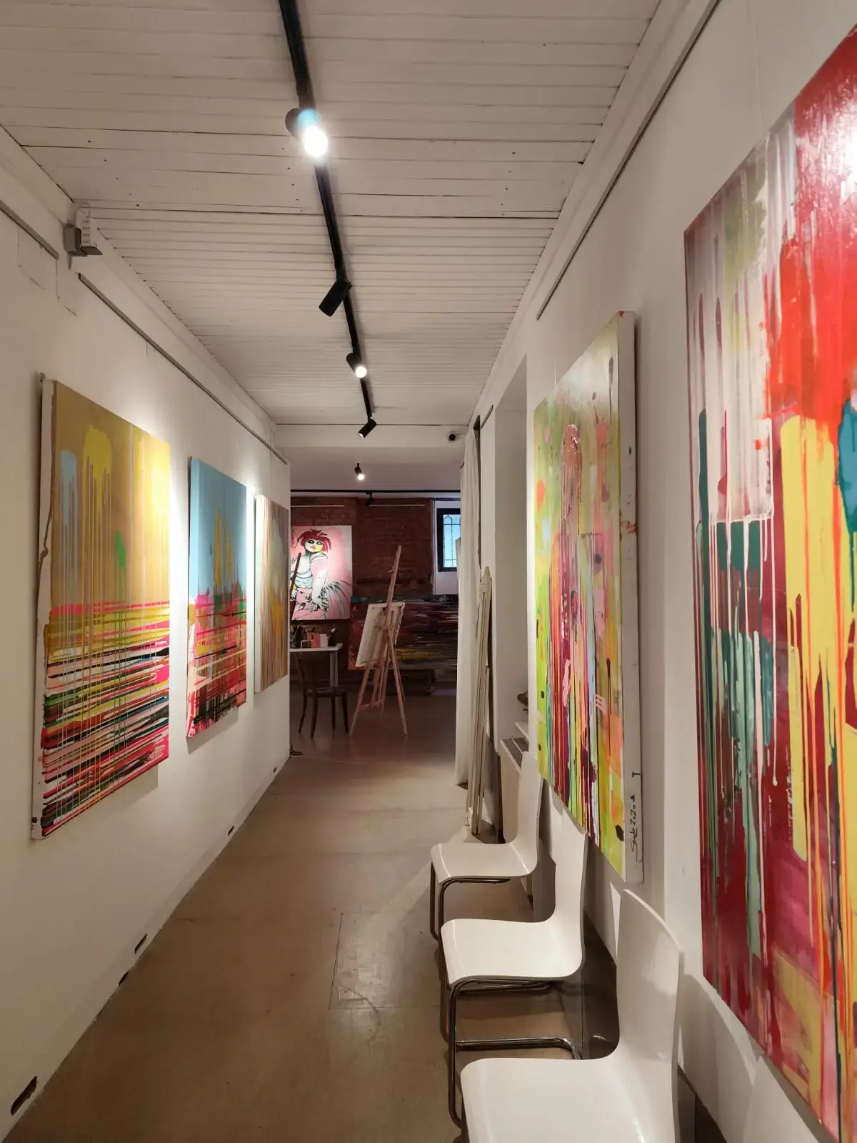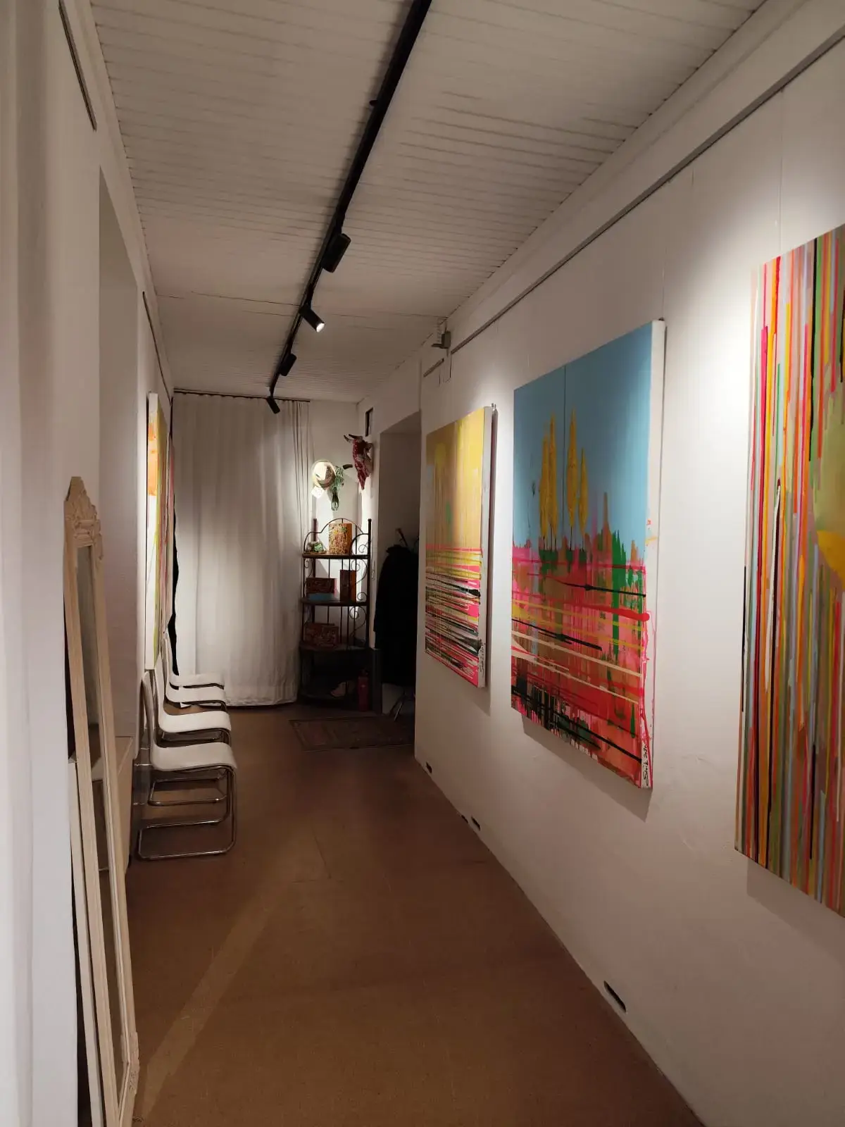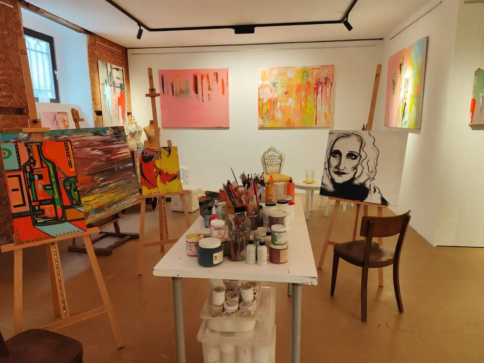 Eine kleine Küche samt Kühlschrank und Spüle, eine Toilette, Heizung, Möbel und eine Musikanlage sind ebenso vorhanden wie Galerieschienen, ein Beleuchtungssystem, Staffeleien und Basis-Malutensilien.